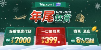【雙12聖誕激賞 Mega Sale】機票一口價$599起!酒店一口價$199起!$1,600高鐵及酒店優惠代碼、3,000 Trip Coins 回贈、買一送一玩樂門票