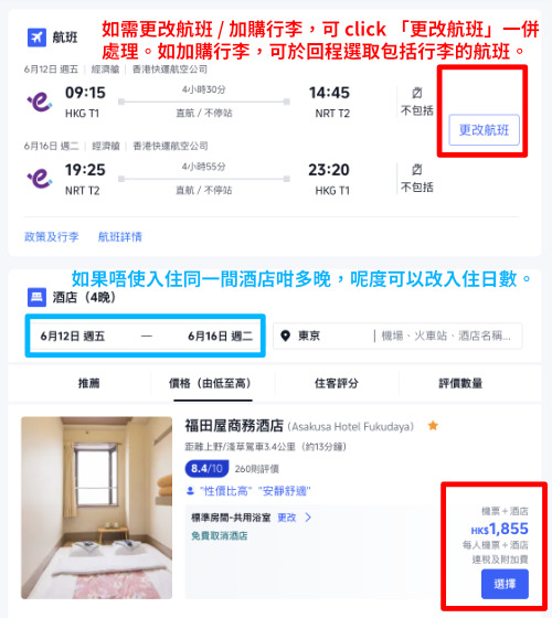 以6月12日出發,6月16日回程為例,HK Express 東京來回機票連以下酒店 (2人同行每位計):